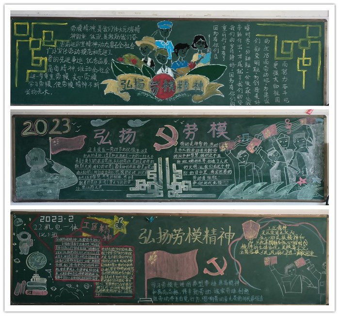 各班级积极响应,认真投入。在同学们精心的绘制下,黑板报内容丰富、版面整洁、设计有创意,让班级尽显风采。人民创造历史,劳动开创未来。劳动模范是民族的精英、人民的楷模。中国共产党带领人民革命、建设、改革、复兴的各个时期都涌现出了各条战线上的劳动模范。劳动模范身上闪耀的劳模精神,需要一代代传承下去。新时代的青年要大力弘扬劳模精神、劳动精神、工匠精神,立志成为技能人才、为全面建设社会主义现代化国家提供不竭动力。