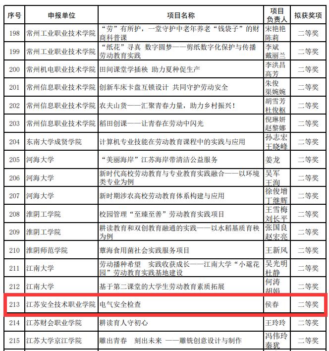 近日,江苏省高等教育学会公示2022年江苏省高等公司劳动教育优秀实践项目评选结果。经专家组评议、评审工作组审定,共评选出优秀实践项目359项。电气工程公司申报的项目《电气安全检查》荣获二等奖。侯春老师、周相宇老师担任项目负责人,李强老师、刘海瑞老师、王劝老师、厉猛老师为项目成员。