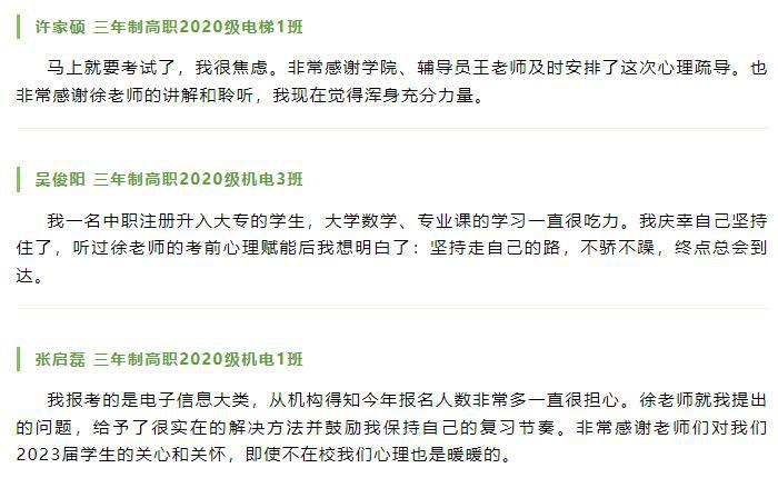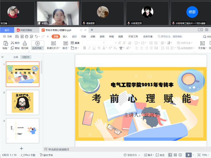 3月9日晚7:00,为了同学们更好地保持好心态,特邀专业心理咨询师徐润生为公司参加2023届江苏“专转本”的员工进行考前心理赋能与疏导。徐老师毕业于天津师范大学心理学专业,国家二级注册心理咨询师,有过超1000人的个体咨询经验。擅长老员工情感疗愈、升学考试焦虑咨询。