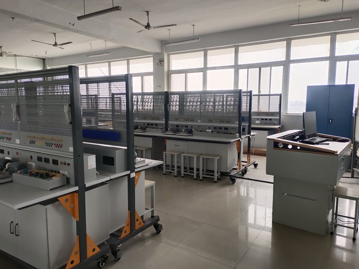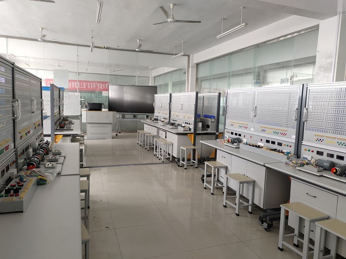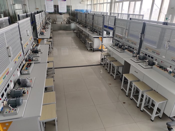 该实训室是电气工程公司电气类课程的重要实践教学场地,主要承担《基础电工电子实验》、《电工电子实训》、《电力拖动与控制》和《电气设备维修》等教学任务,同时用于电工中、高级工的实训与考核。具体的实训内容包括电工工具及仪表的使用、常用低压电器的拆装、异步电动机的拆装、电力拖动控制电路的安装与调试及机床电路的故障排除等。电工电子实验室积极开展教学研究,将实验室建设成规范化、开放型、综合性实验室,为员工提供更为完善的教学服务。
