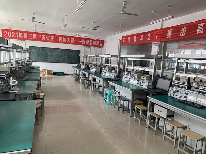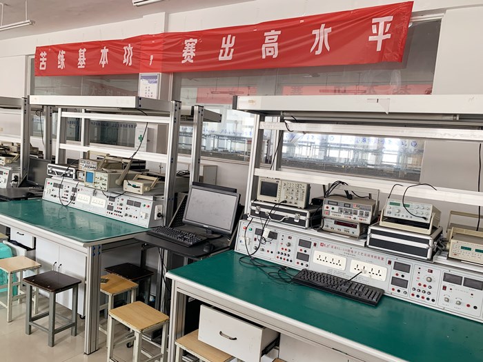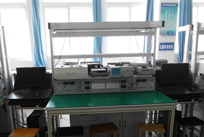 本实训室拥有20台亚龙YL-291电子综合实训台,数字示波器、模拟示波器等20台,信号发生器、频率计、毫伏表、万用表及两路直流稳压电源,同时配备常用焊接工具,能够满足教学、实训以及技能大赛训练,可用于电工电子产品制作与调试的情境教学、电子安装实习、电子技能训练教学、电子实训教学以及电子装配工职业技能鉴定工作。