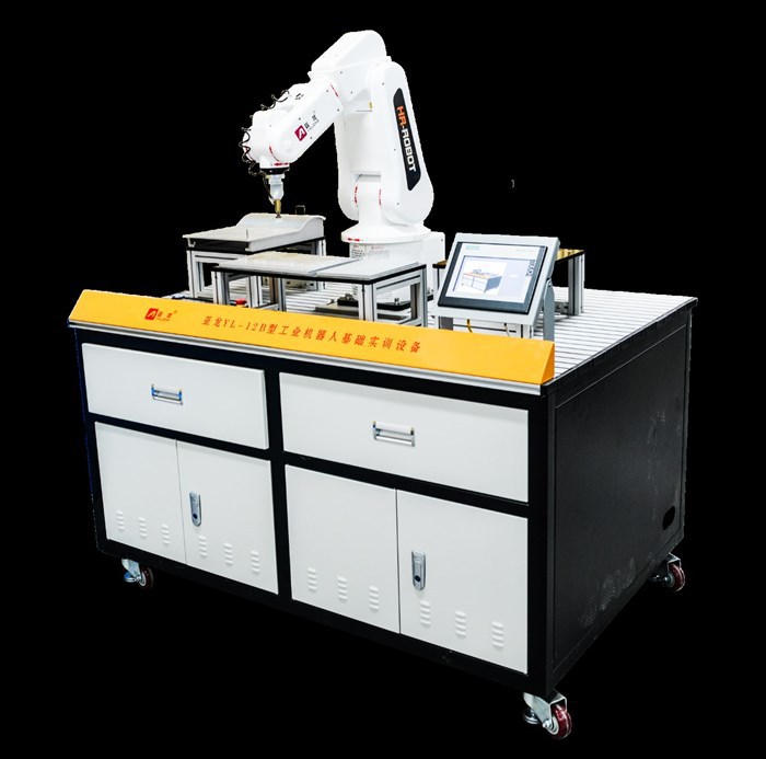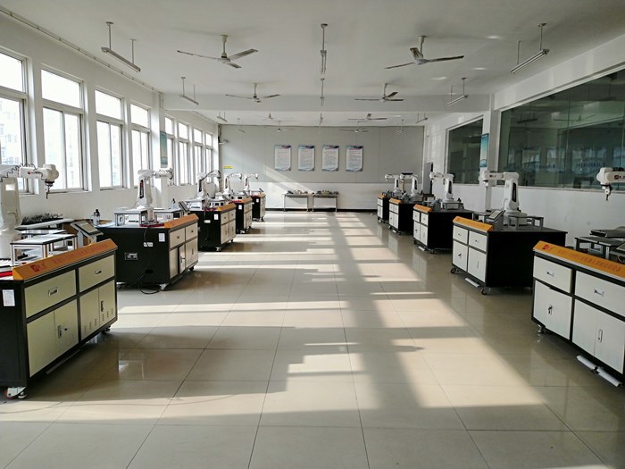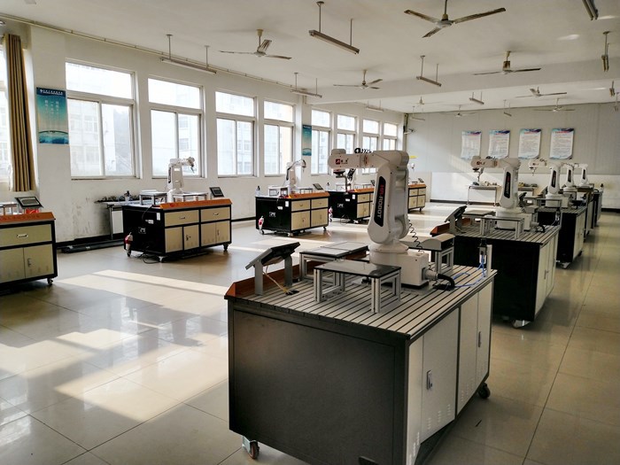 本实训室配备10台亚龙YL-12B型工业机器人基础实训设备,每台实训设备由一台六轴工业机器人、书写工作站、曲面轨迹工作站、码垛工作站、实训桌、电气控制部分组成。本实训室可用于工业机器人技术专业教学、实训,也可以进行企业员工社会培训、提供技能大赛训练场地,同时还可以用于教科研活动和技能鉴定场所用地。