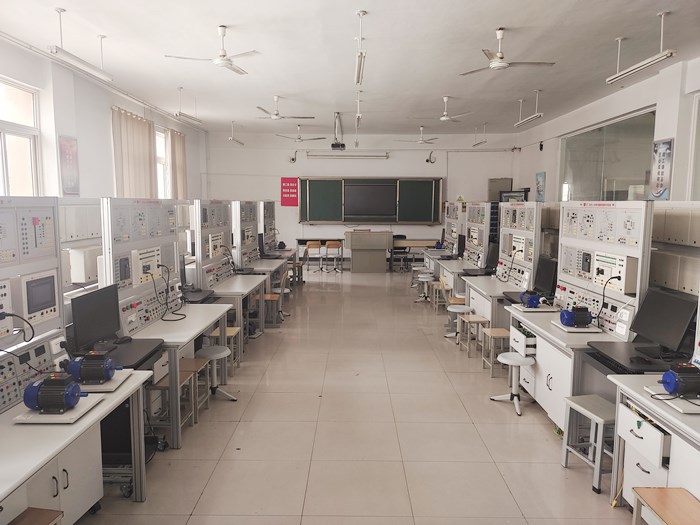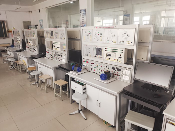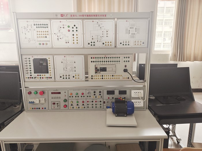 可编程控制器实训室位于实训楼B9-303,建设于2020年,拥有亚龙YL360型设备24台,总价值七十余万。亚龙YL360型可编程控制器实训装置以模块化组合设计,实训台由电源模块、时间控制模块、按钮指示灯模块、PLC模块、变频器模块、触摸屏模块、电机控制模块、步进电机模块、铁塔之光模块、邮件分拣机模块、自控成型机模块、自动轧钢机模块、多种液体混合模块、全自动洗衣机模块、电镀生产线控制模块、交通灯模块、水塔水位模块、自动送料装车系统模块、四层电梯控制模块、直线运动控制模块、小车运动控制模块、自动售货机模块、机械手装配搬运模块、音乐喷泉模块、抢答器控制模块、温度PID控制模块等组成。其模块的多样化既可以满足机电大类下各专业的日常教学,完成电工中、高级工职业资格证书的考核,也是员工集中实习、技能竞赛训练和创新实践的平台,是专业“教学做一体化”的实训室。该实训室可以实现企业真实任务,企业制度管理,行业标准评价,集教学、培训、技能鉴定为一体,为实行“校内工学交替与校外工学交替相结合”的人才培养模式创造条件。