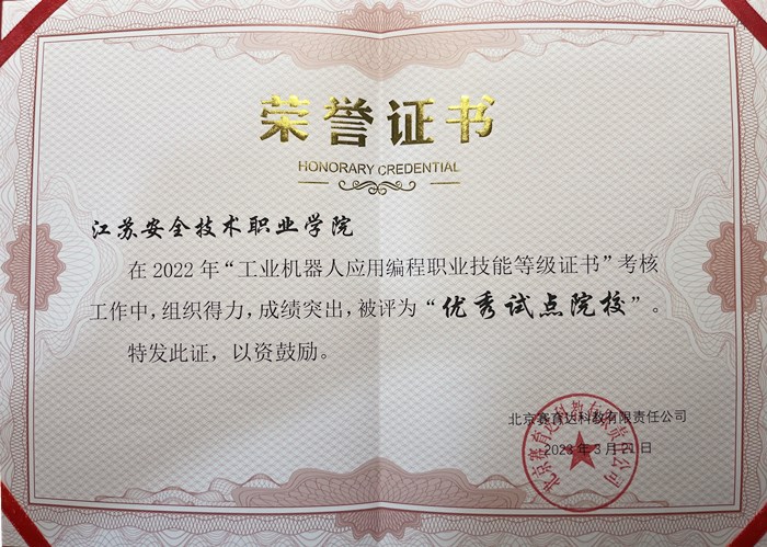近日,教育主管部门指定的“工业机器人应用编程职业技能等级证书”评价组织北京赛育达科教有限公司,对2022年1+X证书试点工作进行总结。公司在2022年“工业机器人应用编程职业技能等级证书”考核工作中,组织得力,成绩突出,被评为“优秀试点院校”。