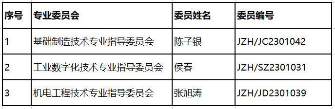 陈子银被聘为基础制造技术专业指导委员会委员,侯春被聘为工业数字化技术专业指导委员会委员,张旭涛被聘为机电工程技术专业指导委员会委员。