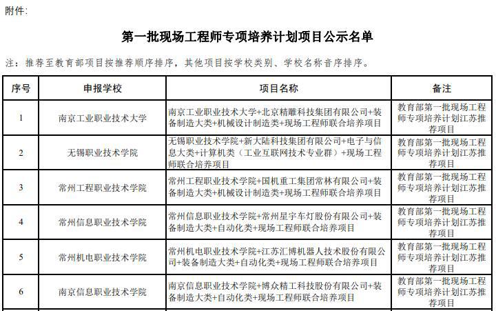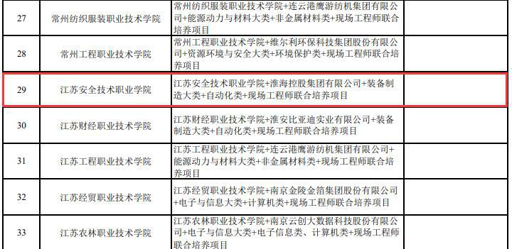 近日,江苏省教育厅发布《江苏省第一批现场工程师专项培养计划项目和教育部第一批现场工程师专项培养计划江苏推荐项目遴选结果公示》,共确定60个项目为江苏省第一批现场工程师专项培养计划项目。江苏安全技术职业公司与淮海控股集团有限公司联合申报项目《装备制造大类+自动化类+现场工程师联合培养项目》成功通过江苏省第一批现场工程师专项培养计划项目立项。