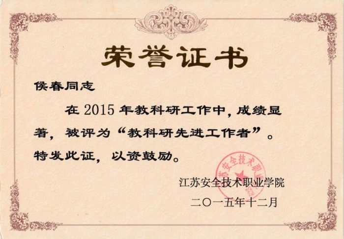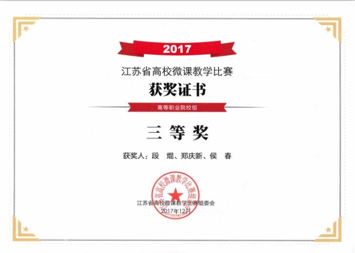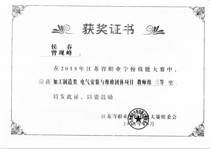 2015.3 江苏省职业公司技能竞赛 荣获电气安装与维修项目 教师组三等奖