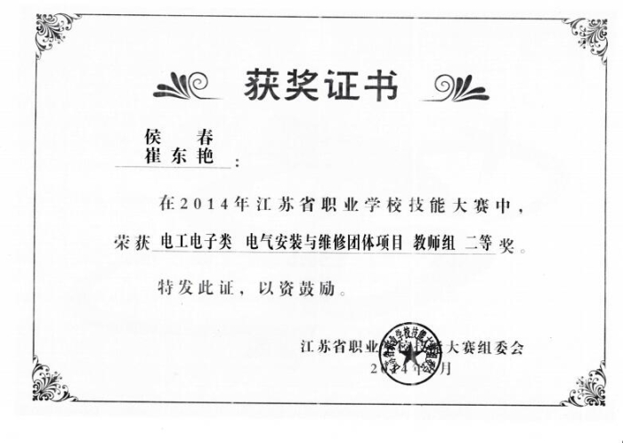 2014.3 江苏省职业公司技能竞赛 荣获电气安装与维修项目 教师组二等奖
