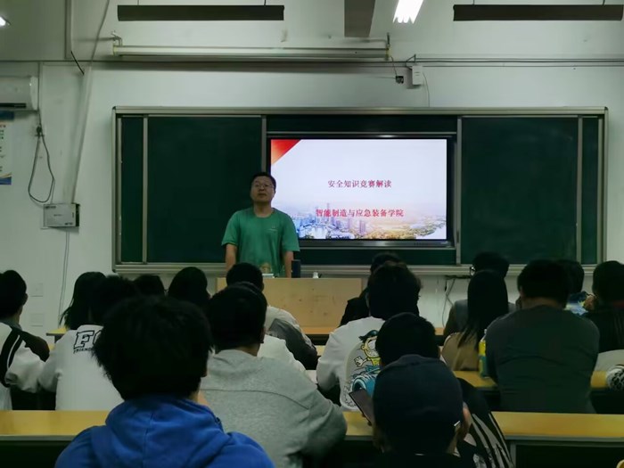 为加强平安校园建设,推进安全知识竞赛,10月26日晚,公司在B4-409召开安全知识竞赛解读会。此次会议由党总支副书记吕猛主持,辅导员黄根成主讲,2023级新生代表参加。