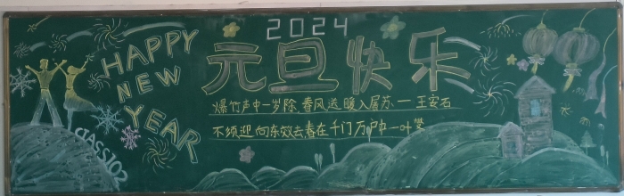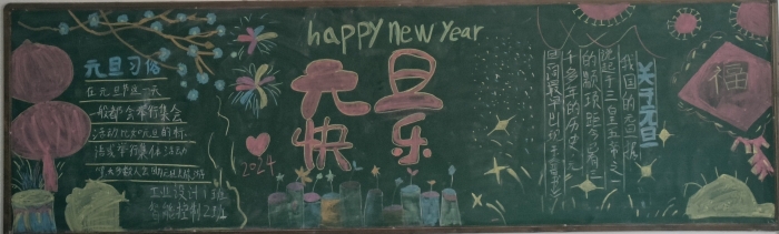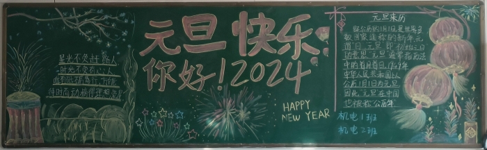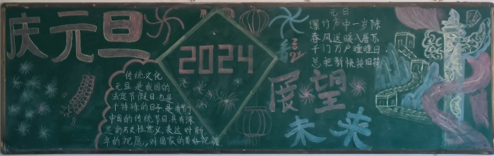 辞旧迎新又一年。2023年,同学们充满信心、勤奋学习、砥砺奋斗,在知识学习、专业技能、个人素养等方面都取得了不一样的收获。同学们总结一年来的努力、收获的成绩,感受一路走来遇到的困难、压力,战胜挫折的喜悦,自身展现出的自强不息精神。展望2024年,同学们心中充满希望,集思广益、大展身手、团结协作,把黑板变成展现才艺的舞台,把对2024年的期待融入到黑板报的设计中。通过丰富多样的黑板报展现此时的愉快心情,期待新年自己的人生更加出彩,梦想都能成真。