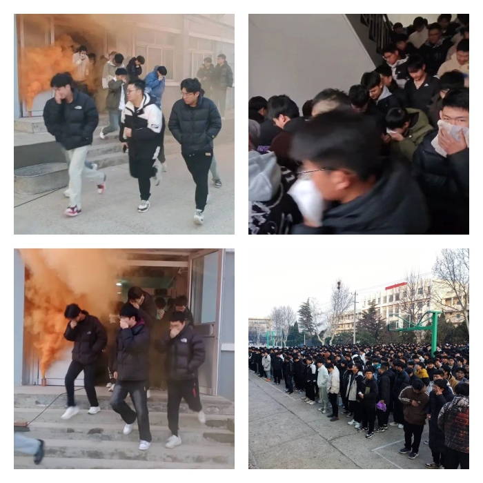 上午6点50分,随着火警警报的响起,各班级在负责教师及员工会的组织和引导下,迅速撤离宿舍楼,按照预定路线进行疏散。伴随着阵阵浓烟,员工们捂住口鼻迅速跑出宿舍,工作人员在班级队伍后面指挥,组织员工按指定路线迅速、有序下楼并在指定地点集合。