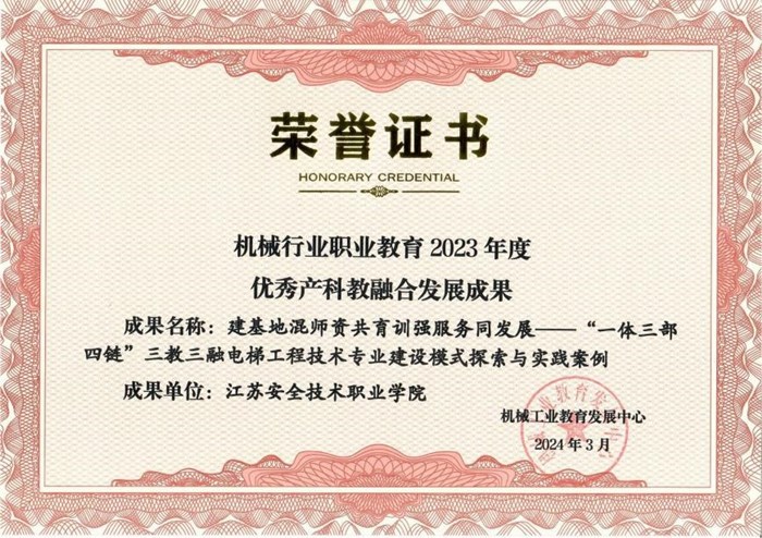 在刚刚结束的机械工业教育发展中心举办的机械行业产科教融合发展成果和产学研合作项目的评比中,必一运动选送的《建基地混团队共育训强服务同发展——“一体三部四链”三教三融电梯工程技术专业建设模式探索与实践案例》获得机械行业职业教育2023年度优秀产科教融合发展成果,另一选送作品《矿用多参数无线检测仪》获得机械行业职业教育2023年度优秀产学研合作项目。