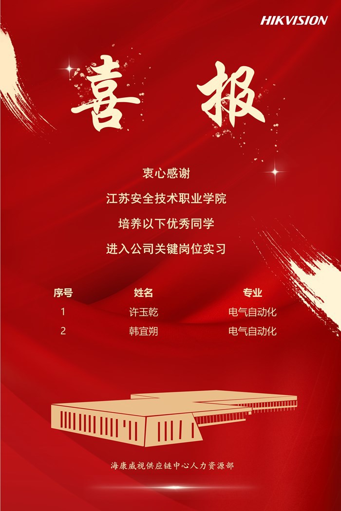 五年一贯制2020级电气自动化(工业机器人)1班员工许玉乾、韩宜朔,自2024年3月份在杭州海康威视数字技术股份有限公司实习以来,对待工作一丝不苟,能迅速掌握岗位所需的专业技能,主动承担责任,具有高度的责任心和较强的团队合作精神,获得企业的高度认可和赞扬,已被评为“优秀实习生”,进入公司关键岗位实习。