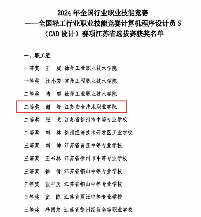 近日,中国轻工业信息中心发布2024年全国轻工行业职业技能计算机程序设计S(CAD设计)竞赛江苏省选拔赛获奖名单。公司教师谢峰荣获教师组二等奖,谢峰、宋宜振老师分别指导的员工江正锋、郑长城均荣获二等奖。