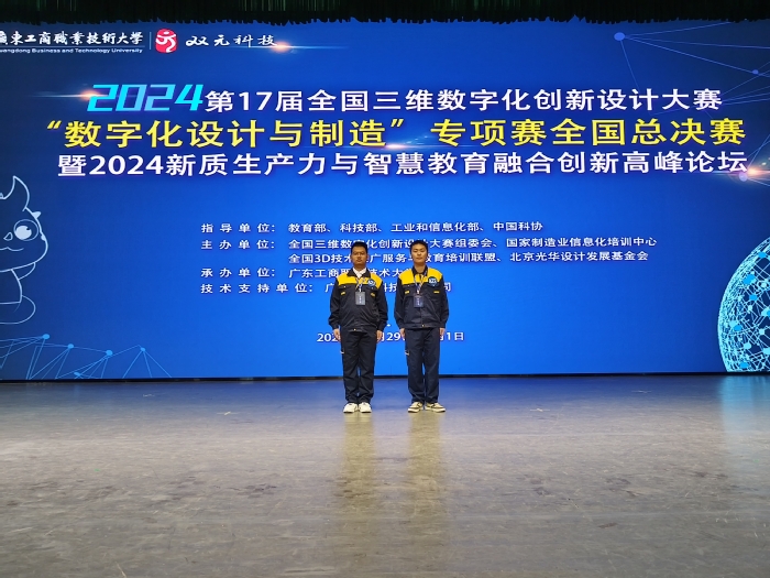 11月29日—12月1日,第17届全国三维数字化创新设计大赛数字化设计与制造专项赛全国总决赛在广东工商职业技术大学举行。历经激烈角逐,公司教师谢峰、宋宜振指导的江正锋、郑长城团队荣获三等奖。