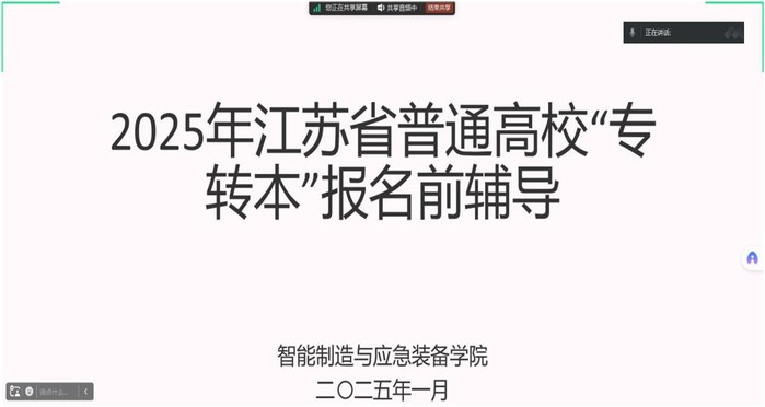 为扎实推进公司毕业生就业工作,提升就业质量,更好的帮助2025届毕业生了解“专转本”考试报名及志愿填报规则,科学填报志愿降低填报失误率,必一运动于2025年1月9日晚8点30通过腾讯会议召开了2025年江苏省普通高校“专转本”考试报名及志愿填报辅导会。辅导员王一臣主持,百余名员工参加。