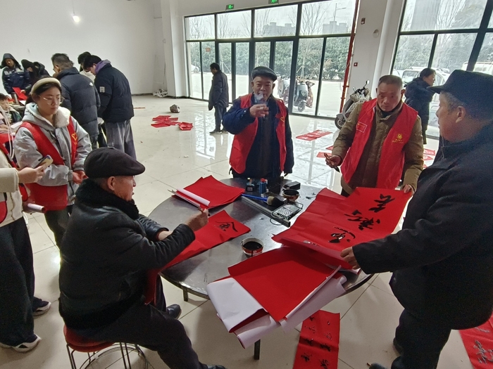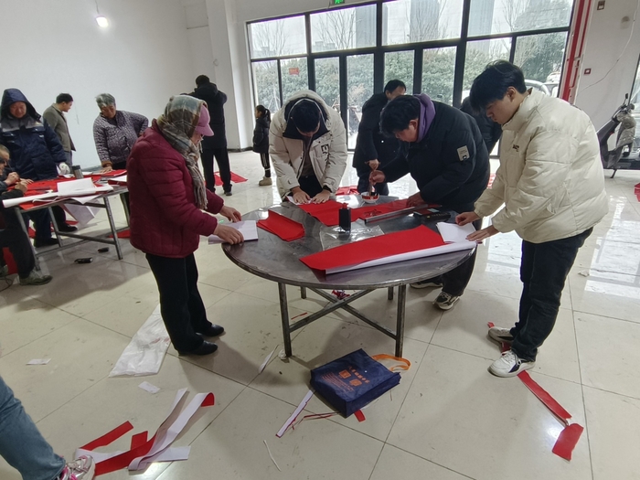 临近春节,荆山村张灯结彩,热闹非凡。1月25日,在村委会的邀请下,乡村文化小分队再次来到荆山村,参与了村里的迎春活动。队员们与当地村民一起写春联、制作传统剪纸,充分体验了荆山村的春节习俗和文化氛围。队员们早早来到现场,摆好桌椅,铺好宣纸,备好墨汁,做好准备工作。在活动中,村民们向小分队成员们传授了对联的书写技巧和平仄韵律,让他们深刻感受到了汉字文化的博大精深。
