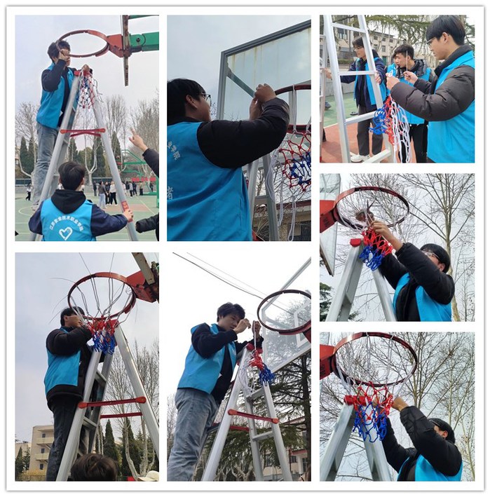 篮球架上,一名志愿者小心翼翼地爬上梯子,专注地将篮网与篮筐进行固定,凛冽的风也没能吹乱他认真的神情。地面上,几位志愿者紧紧扶着梯子,其中一人还不时抬起手,为高处的伙伴指引位置,眼神中满是关切与认真。