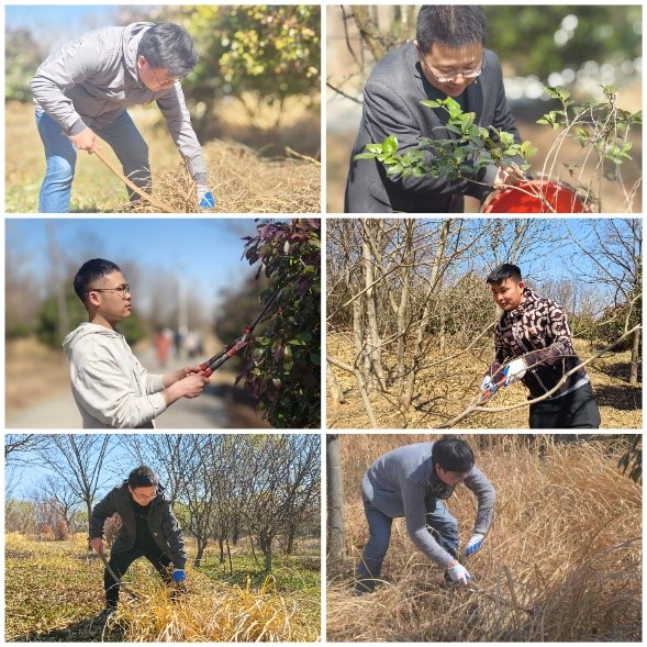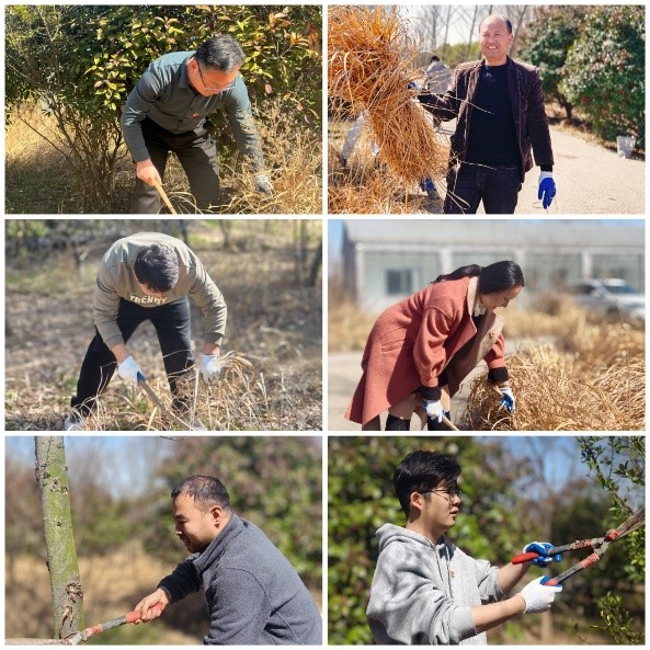 党员们满怀热忱、精神饱满地到达江庄镇苗圃园后便迅速集合,聆听园林技术人员的悉心指导。园林工作人员向支部党员科普苗木修剪、病虫害防治等养护知识,指导开展除草、修枝等实践操作。党员们根据各自专业特长迅速分组,投身到抚育工作中,按照科学的修剪原则,对树枝进行精心修剪,促进树木茁壮成长。同时,党员们不怕脏、不怕累,认真开展杂草清除、园林灌溉等工作,为园林建设贡献力量。