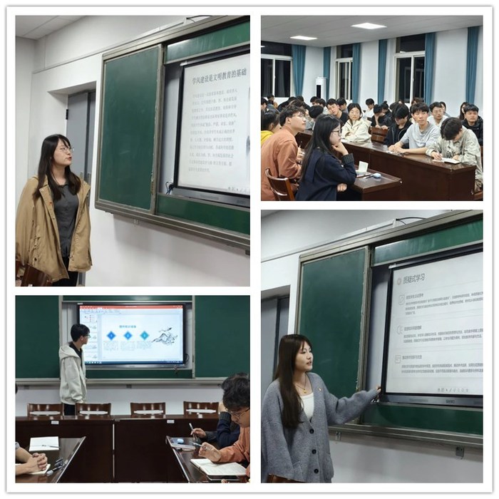 由团支书代表24级智控1班的王京倩同学和24级智控2班的黄宇阳同学为我们带来了有关“学思并进促学风,笃学尚行育良才”的主题教育。主要从学风现状与问题、学用转化实施、人才培养与成长、学风建设的含义、如何促进学风建设,和学风建设的未来展望多个方面展开讲解。本次主题教育强调了学习与思考的紧密联合,引导同学们认识到学习不仅仅是获得知识的过程更是培养思维和创新精神的重要途径。同时强调了“笃学尚行”的重要性,鼓励各位同学既要扎实学习理论知识,又要勇于实践,敢于担当,注重培养同学们的创新精神和实践能力。