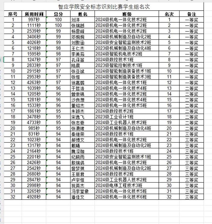 本次比赛通过问卷星网上答题,考题内容涵盖禁止标志、警告标志、指令标志、提示标志四种安全标志。实训中心参考国家标准《安全色和安全标志》组成选择题152个,考试随机抽取100个,答对1题得1分。按成绩高低进行排名,成绩相同者,再按答题时间排序。最终,教师组18人获奖,员工组32人获奖。