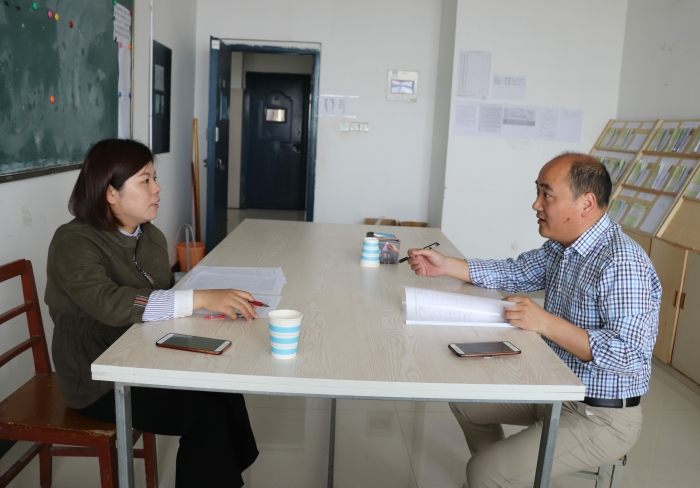 电气系主任王郝与教务处牛艳老师现场指导答辩的总体工作安排,明确答辩员工报到、签字审核、资料收缴等工作的具体细则,为员工答辩做好保障工作。