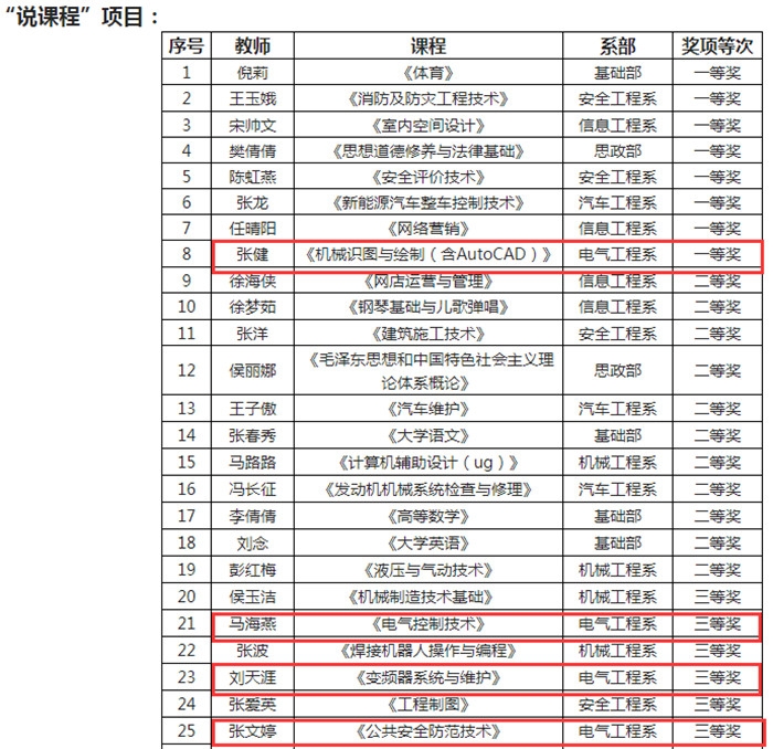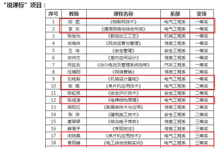 为保证参赛效果,我系各教研室按照比赛评比要求,经过多次模拟后,推选优秀教师参赛。经过教务处一次评审,校外专家二次评审,在“说课标”项目比赛中,电气系段焜老师、李庆老师、刘艳梨老师荣获一等奖,张鹏老师、张旭涛老师荣获二等奖,宋陆昊老师、曾现峰老师荣获三等奖。在“说课程”项目比赛中,张健老师荣获一等奖,马海燕老师、刘天涯老师、张文婷老师荣获三等奖。(文/王劝)