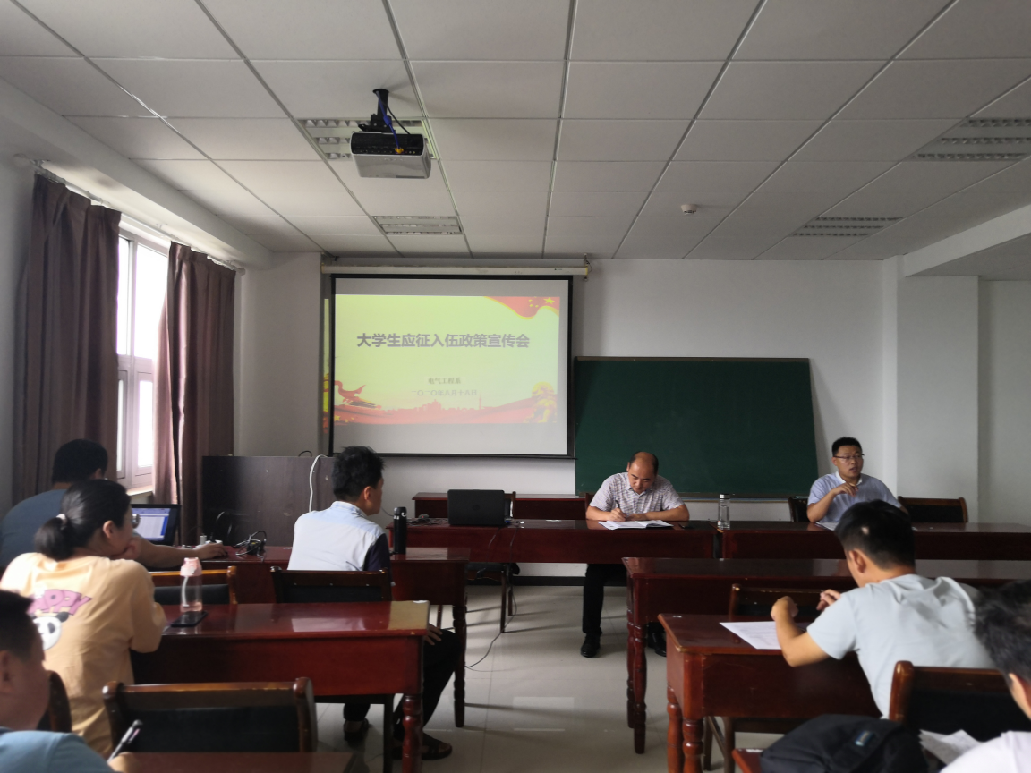 2020年8月18日下午,电气工程系在云龙校区915室组织17级毕业班级班主任召开老员工应征入伍政策专题宣讲会。系部主任王郝、副主任兼员工党支部书记吕猛参加,会议由吕猛主持。