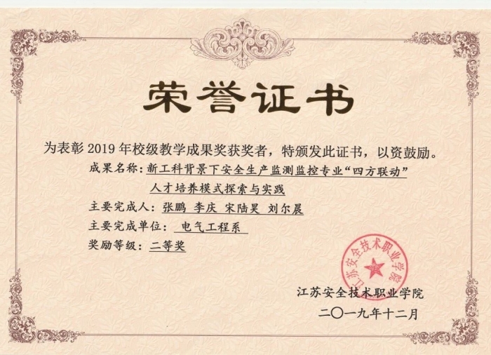 新工科背景下安全生产监测监控专业“四方联动”人才培养模式探索与实践教学成果奖 | 2019年 | B-Sports | 院级二等奖 |