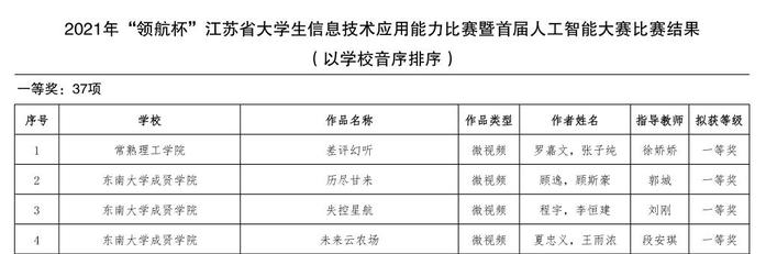 根据《省教育厅办公室关于举办2021年“领航杯”江苏省教育信息化应用能力大赛的通知》(苏教办信函〔2021〕4号)和《关于举办2021年“领航杯”江苏省老员工信息技术应用能力比赛暨首届人工智能》(苏教信办〔2021〕24号)要求,经公司遴选,全省共收到111所院校申报的646项作品,作品类型涉及微视频、软件开发和人工智能3大类别。经专家分组评议,共评选出获奖作品263项。