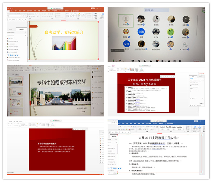 一是传达公司2021年度优秀团学组织、优秀个人评选的通知。班主任带领学习文件内容,根据评选条件、奖项名额分配情况,确定班级申请的员工名单。参与优秀申报的同学,要志存高远,坚定理想信念,锤炼品德,正心明志,砥砺奋斗,勇于创新,以真才实学展现新时代青年的新力量。二是自考招生宣讲。根据继续教育公司提供的相关资料,班主任细致全面地向员工们宣讲自考相关政策。解答员工们提出的各种疑问,鼓励员工们抓住学历提升的机会,积极报名。提升学历,既有利于调动员工的学习潜能,提高专业素质,又有利于拓宽员工们的就业渠道,有利于员工成才成长。希望同学们珍惜机会、抓住机会,努力拼搏。三是对开学未返校员工、返校后请假回家员工做好疫情防控教育,防诈骗、防火、防溺水、交通、用电等安全教育,意识形态舆情教育,居家网课的上课纪律教育。四是疫情期间公司组织的文体活动,鼓励员工们踊跃参与。主要是计步打卡强身健体活动、主题观影及影评征集活动。疫情期间,大家除了认真完成线上学习,还要保持健康的体魄、丰富的课余生活,让疫情常态化管理下的生活与学习更加丰富多彩。
