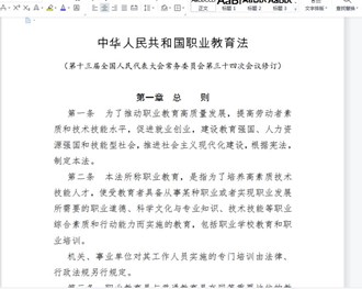 《中华人民共和国职业教育法》于2022年4月20日,第十三届全国人民代表大会常务委员会第三十四次会议通过修订,自2022年5月1日起施行。新职业教育法共八章,主要内容包括:总则、职业教育体系、职业教育的实施、职业公司和职业培训机构、职业教育的教师与受教育者、职业教育的保障、法律责任、附则。