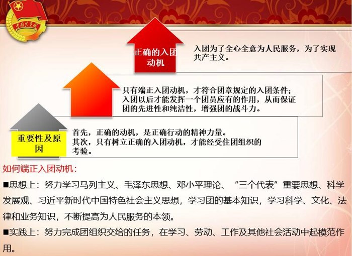 王劝从动机的含义、入团动机、错误的入团动机、正确的入团动机、树立正确动机的重要性、如何端正入团动机多个方面,让员工们重新思考入团动机的重要性,探寻自己入团的初心,坚定了正确的入团动机,认识到入团的光荣与肩上的责任。只有端正了入团动机,才更加符合团员的条件;入团后,才能真正发挥团员应有的作用,进而保证共青团的先进性与纯洁性,增强团组织的战斗力。每位入团积极分子都要回归本身,反思自省,找到内心的答案,坚定对共青团、对共产主义的信仰。