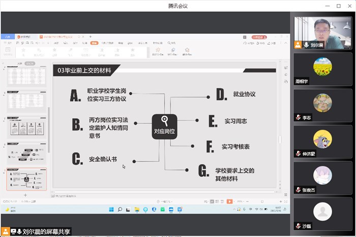 刘尔晨主要强调四个方面的工作。一是招聘会、实习安排及要求。就实习单位、报到方式、实习协议、实习要求等做具体的介绍,并提出要求。二是2023届毕业生须知。同学们要关注安全工作、91job、习讯云、协议、毕业前上交资料,完成离校前的资料提交,为就业做好准备。三是毕业前需要上交的材料。职业公司员工岗位实习三方协议、丙方岗位实习法定监护人知情同意书、安全确认书、就业协议、实习周志、实习考核表等。四是面试技巧与礼仪。给员工们介绍简历的制作、面试的流程、面试需要准备的内容、调整心态、树立正确的就业观等。