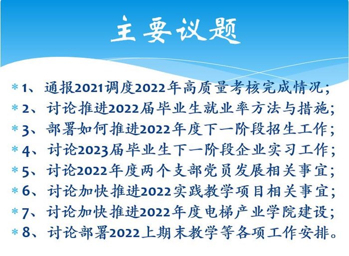本次党政联席会共有八项议题。一是通报2021年度高质量考核情况,调度2022年高质量考核完成情况。二是讨论推进2022届毕业生就业率方法与措施。三是部署如何推进2022年度下一阶段招生工作。四是讨论2023届毕业生下一阶段企业实习工作。五是讨论2022年度两个支部党员发展相关事宜。六是讨论加快推进2022实践教学项目相关事宜。七是讨论加快推进2022年度电梯产业公司建设。八是讨论部署2022上期末教学等各项工作安排。