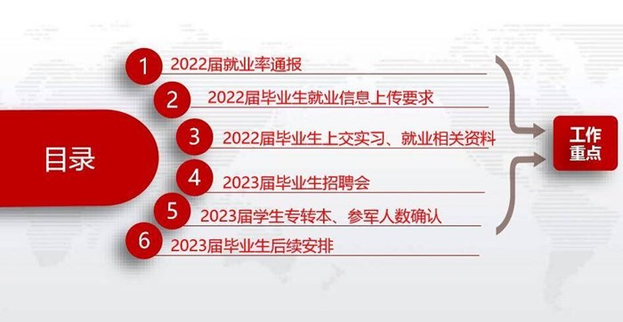 刘尔晨主要强调六个方面的工作。一是2022届就业率通报。各班级就业率的提高,需要各位班主任、辅导员继续提高工作责任感,全力、细致推进,保障此项工作稳步提升。二是2022届毕业生就业信息上传要求。为保障教育部就业核查工作的高效进行,员工就业信息如有变动,特别是联系方式变动,一定要及时反馈给招就处。三是2022届毕业生上交实习、就业相关资料。顶岗实习协议、实习考核表、实习周志、就业协议书等材料的上交,要及时、准确。面临就业的阶段,班主任、辅导员要引导员工树立正确的择业观、就业观,结合专业所学,及早找到心仪的工作。四是2023届毕业生招聘会。传达招聘会的时间安排、参与对象、用人单位招聘流程、招聘会须知等。大家要在员工中积极宣传,鼓励员工们端正态度、认真准备,争取在招聘会上找到合适的就业岗位。五是2023届员工专转本、参军人数确认。六是2023届毕业生后续安排。
