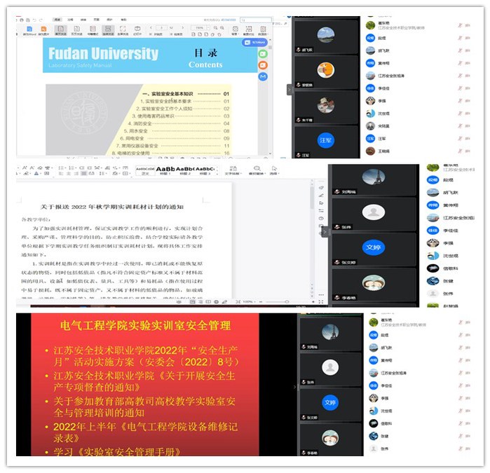侯春带领学习《电气工程公司实验实训室安全管理》、《B-Sports2022年“安全生产月”活动实施方案》、《关于开展安全生产专项督查的通知》、《关于参加教育部高教司教学实验室安全与管理培训的通知》《电气工程公司实验室安全手册》。侯春要求全体教师提高安全意识,认真领会文件精神,将实验室安全与管理制度执行到位,将实验实训室安全检查常态化。